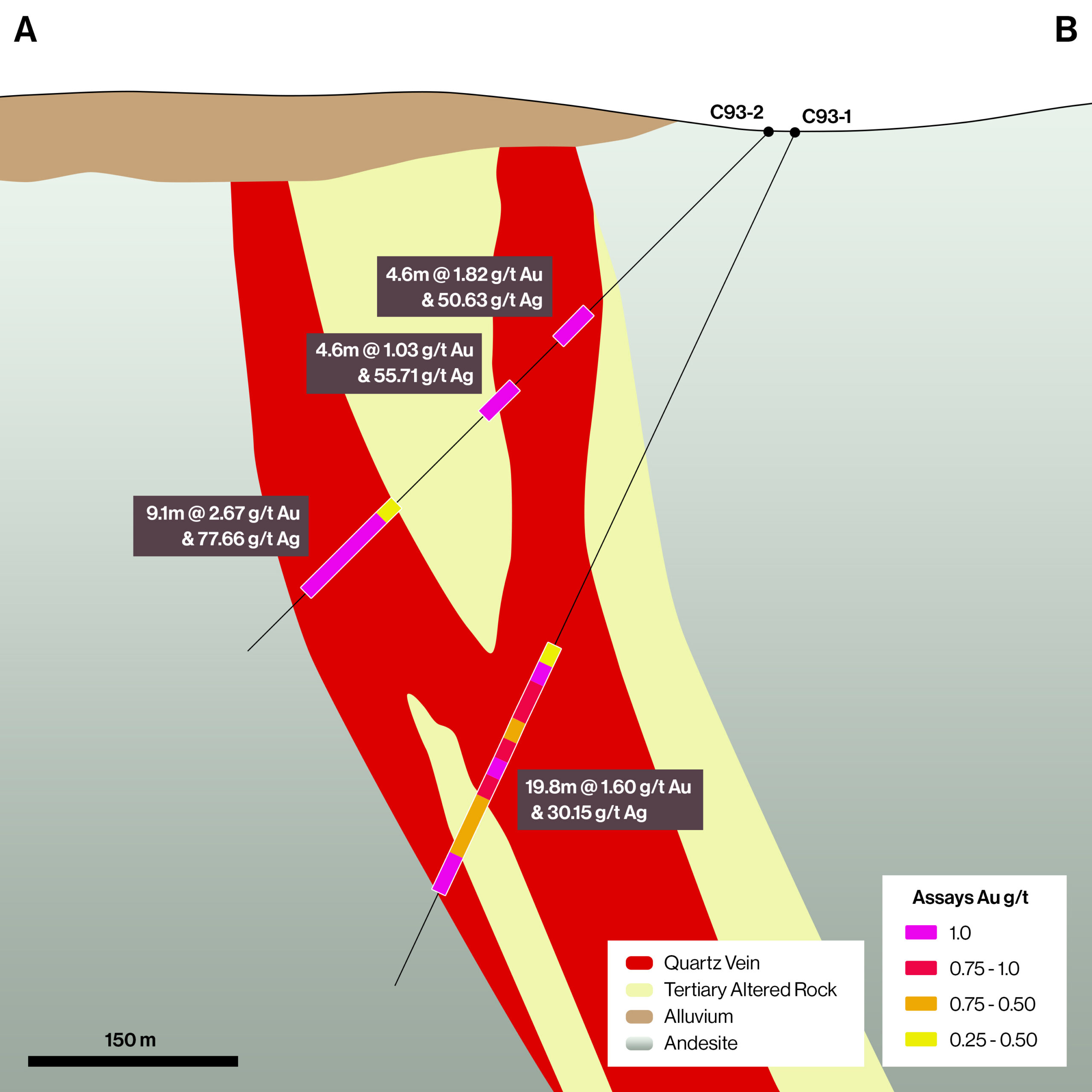 A limited amount of historical drilling has been completed at the Como Mining District, including the acquired unpatented claims. Highlighted intercepts include CA-4 which returned 12.19 meters of 5.00 g/t Au, including 3.05 meters grading 13.88 g/t Au and CA-05 which returned 21.34 meters of 2.02 g/t Au. These holes were targeting the Elgin Vein where a surface sample returned 14.30 g/t Au. No silver data is presented for these two holes.