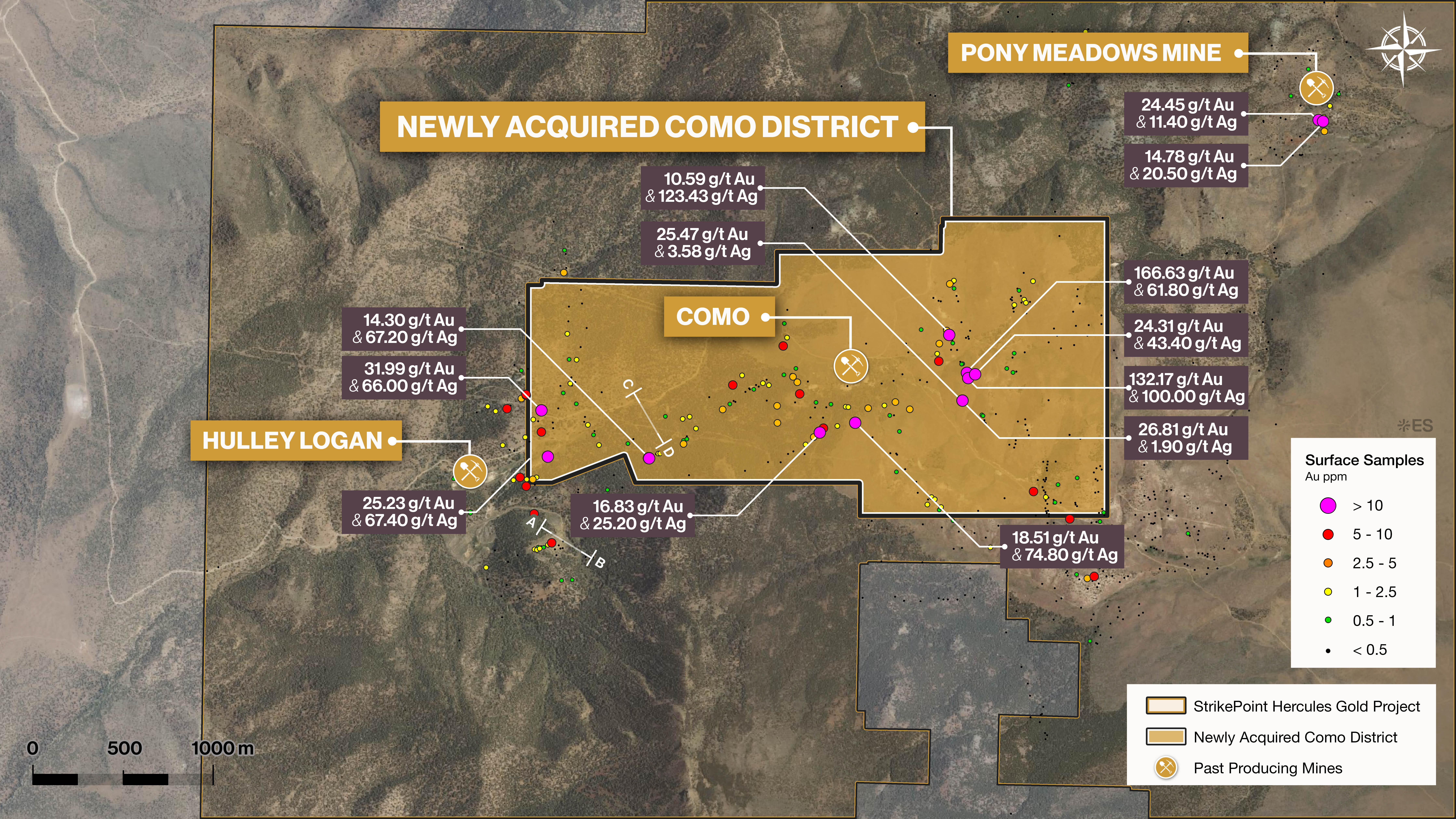 Michael G. Allen, President and CEO of StrikePoint commented, “The historic data shows widespread gold and silver in surface sampling and historical drilling. This transaction consolidates the southern portion of the Hercules Gold Project and allows for effective exploration in the future, along the “Como Trend” which extends between three historical producers, the previously controlled Hulley-Logan Mine, the Como District and the previously controlled Pony Meadows Mine. The Company expects to amend its existing Como Comet drill permit to allow for drilling on these newly acquired claims shortly.”