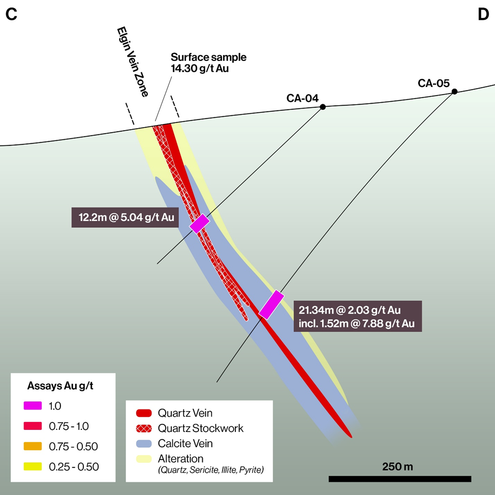 Historical drillhole intercepts include CA-04, 12.19m of 5.00 g/t Au and CA-05, 21.34m of 2.02 g/t Au